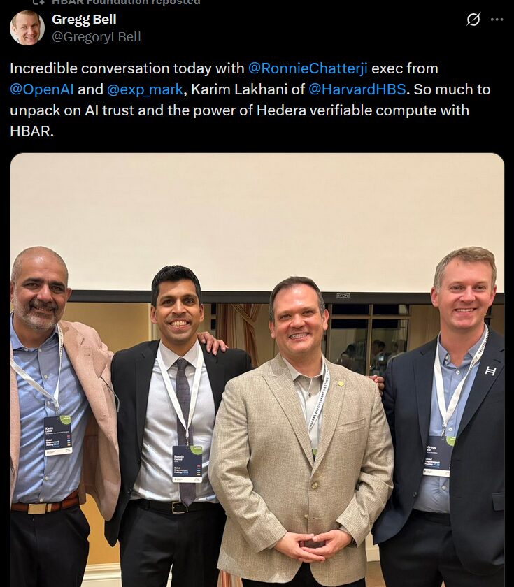 The HBAR Foundation’s Greg Bell updated the Hedera community with a picture from a recent meeting with Dr. Ronnie Chatterji, a current OpenAI executive, and Mark Esposito, a researcher on artificial intelligence.
