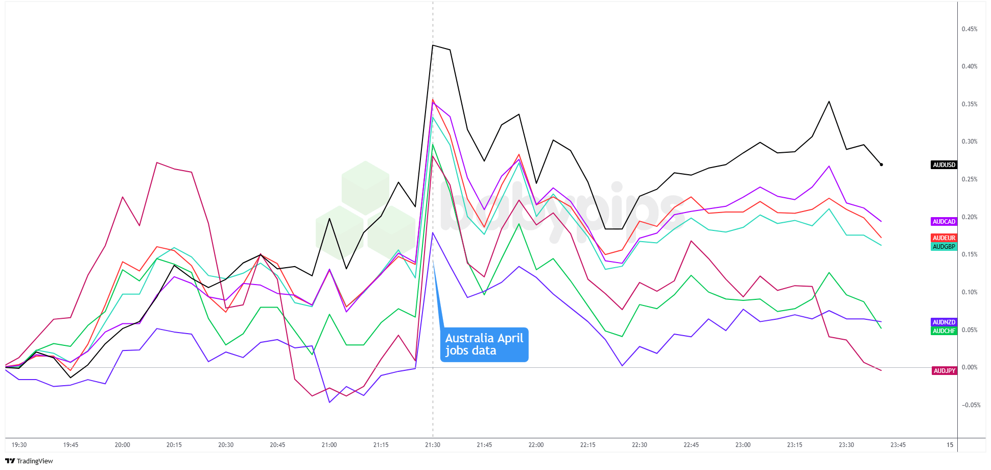 Overlay of AUD Pairs vs. Major Currencies Chart by TradingView