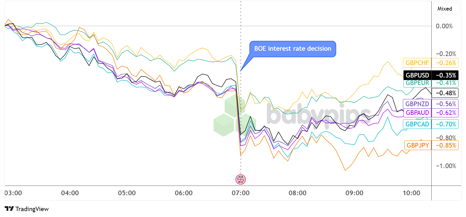Sterling, which had already been edging lower leading up to the BOE decision while market participants braced for a “dovish cut,” saw an even steeper tumble after the announcement.