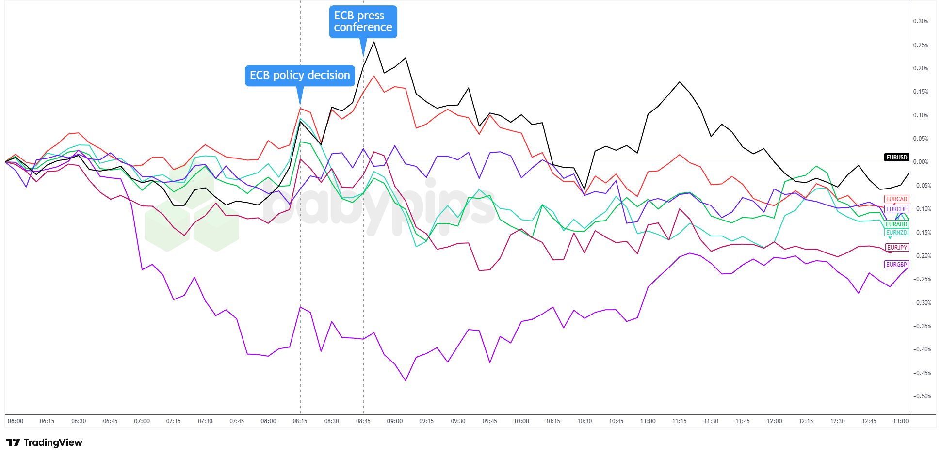 Overlay of EUR vs. Major Currencies Chart by TradingView