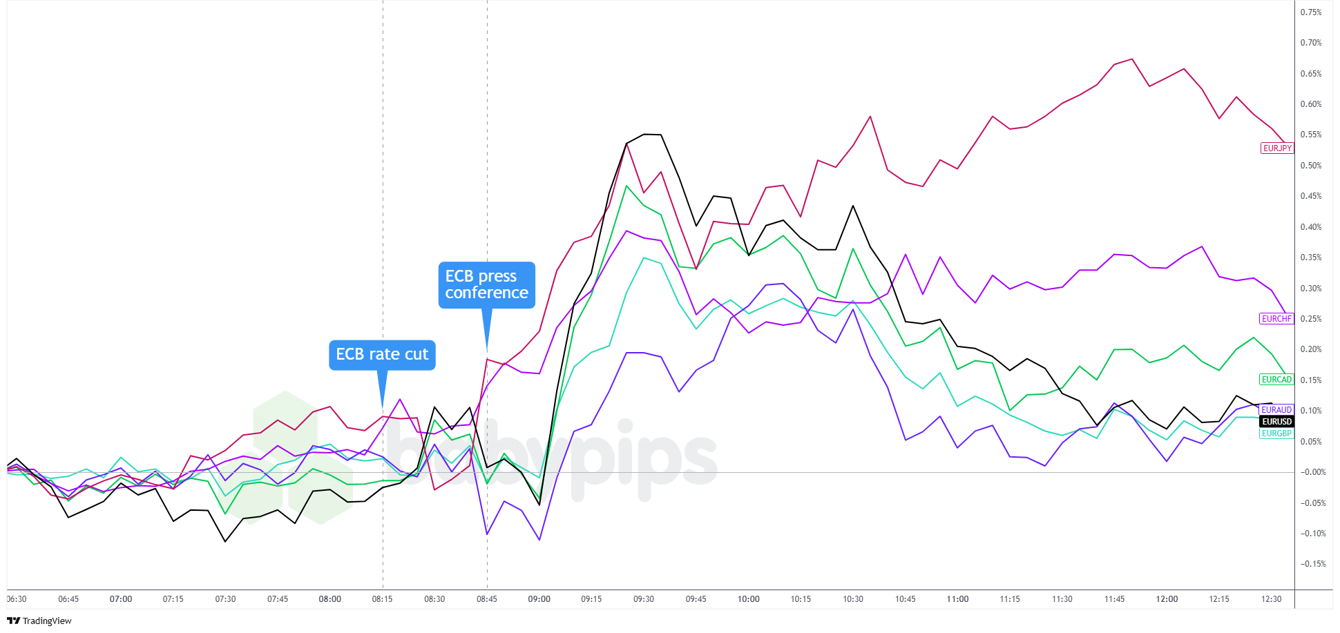 The euro spent most of the lead-up to the ECB decision trading in a tight range with a slight bullish lean. The currency also barely blinked after the expected 25 bps rate cut was announced.