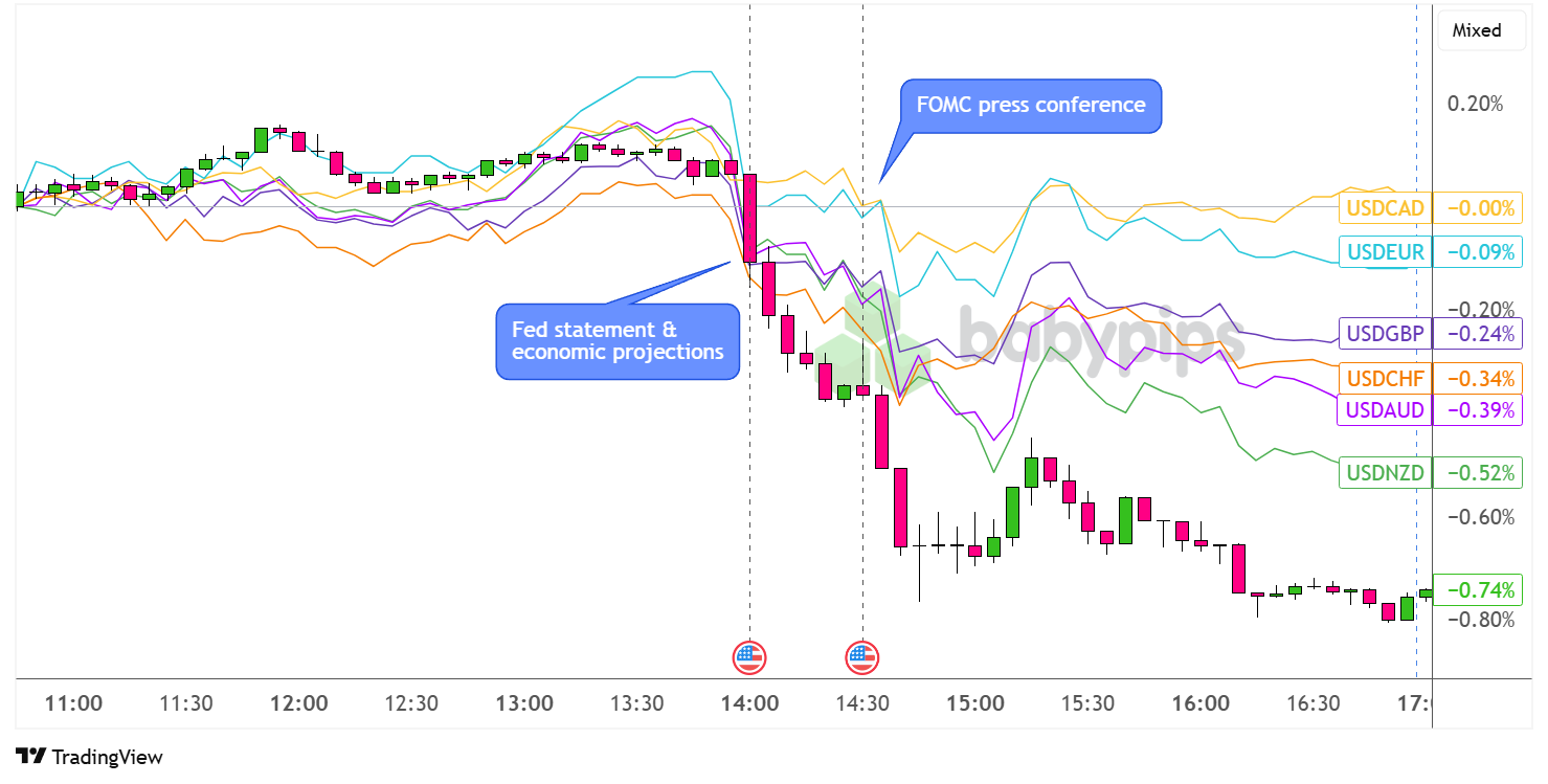 The U.S. dollar, which had been cautiously moving sideways leading up to the top-tier event, dipped during the actual Fed statement and economic projections, as traders reacted to the scaling back of the quantitative tightening program and stagflation concerns.