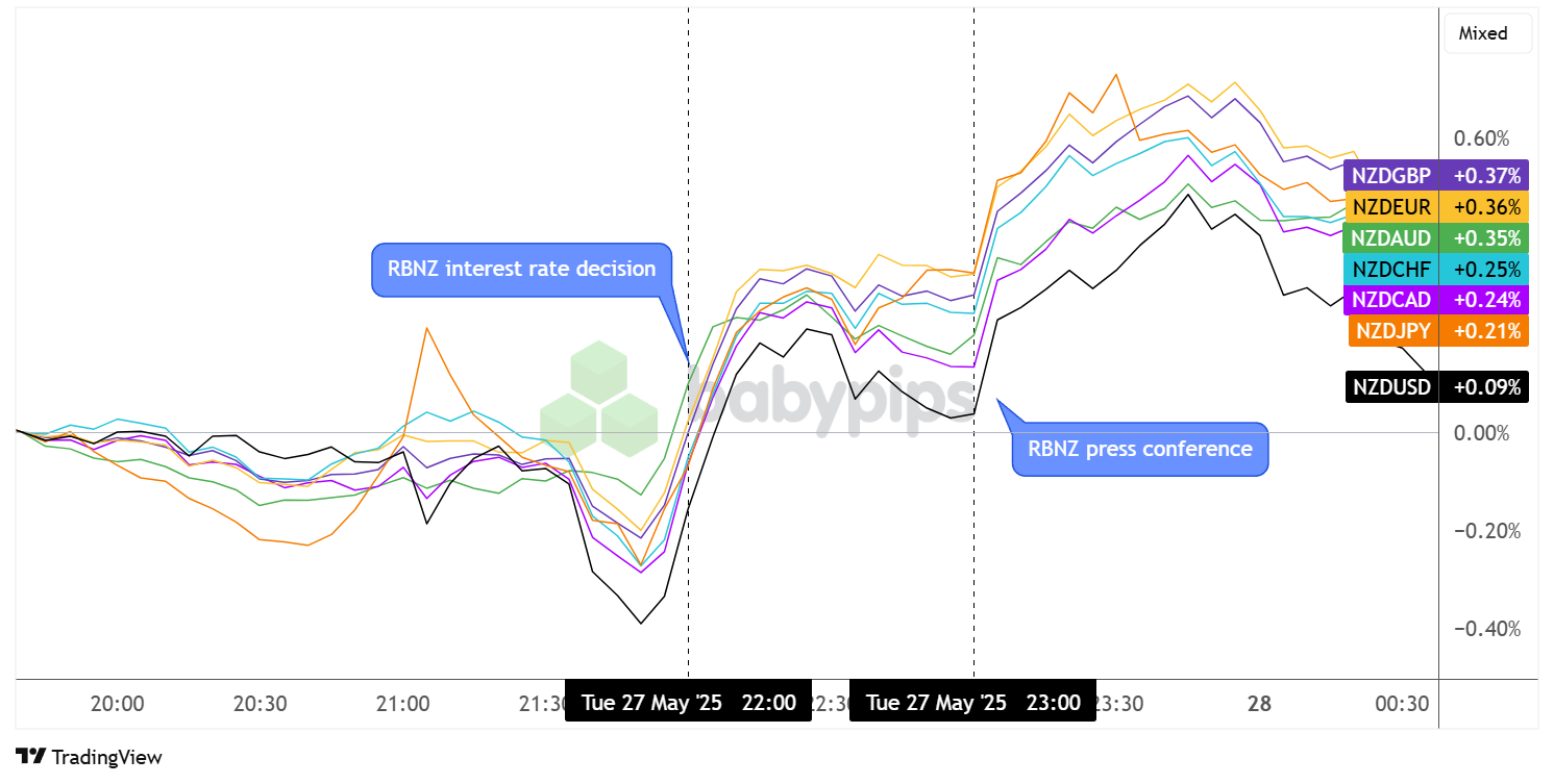 NZD raked in its strongest gains versus GBP (+0.37%) and EUR (+0.37%) a few hours after the actual event while NZDUSD (+0.10%) kept its rallies limited.