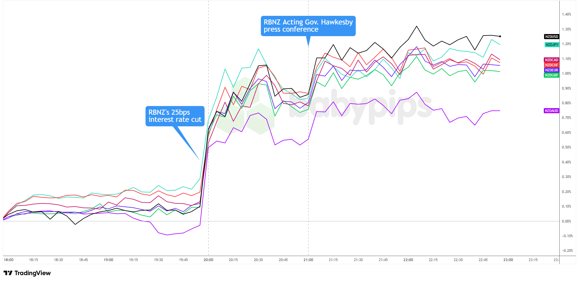 Overlay of NZD vs. Major Currencies Chart by TradingView