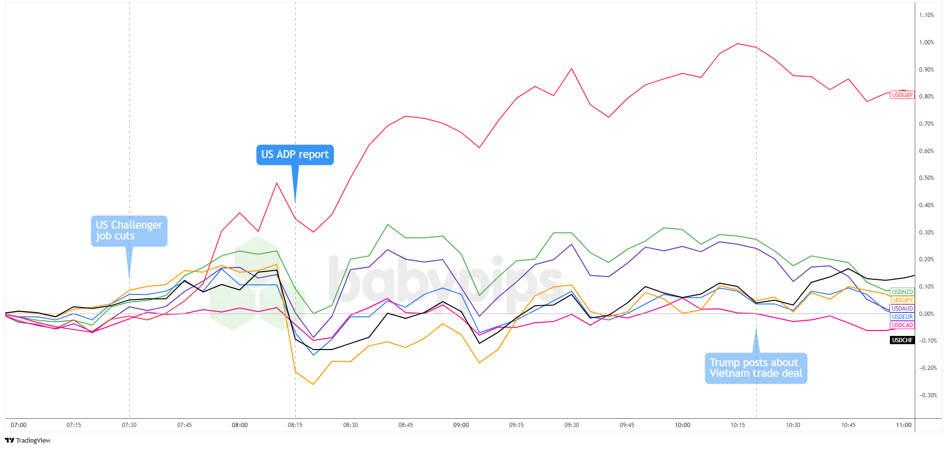 The muted dollar reaction may have been caused by two things. One, ADP has a spotty track record predicting the official NFPs, so traders aren’t exactly scrambling to reposition just yet. And two, even with the ugly headline number, wage growth held steady at 4.4%, which signals the labor market isn’t falling apart just yet.