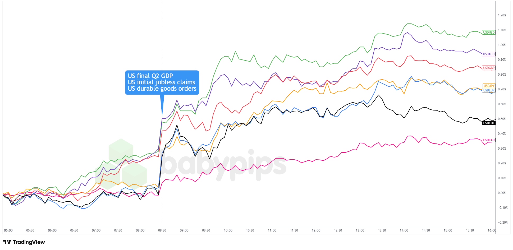 The dollar surged immediately at the data releases, with USD/EUR and USD/CHF leading the charge higher as traders reacted to the stronger-than-expected GDP revision and the sharp drop in jobless claims. The initial spike saw the dollar gain across the board against all major currencies.