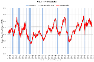 Heavy truck sales were at 422 thousand SAAR in December, down from 491 thousand in November, and down 9.5% from 466 thousand SAAR in December 2023.