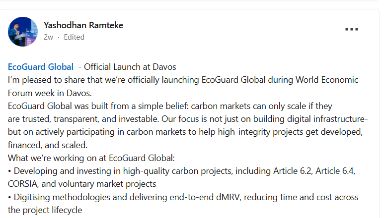 Officially set to launch during the World Economic Forum week at Davos 2026, EcoGuard is designed to fix long-standing structural issues in global carbon markets, including greenwashing, double-counting, and poor scalability.