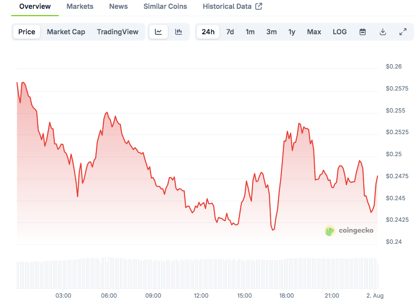 Asghar explained that a bounce from this area could trigger a run toward $0.31 or more. If the trendline fails, price targets shift down toward $0.23 and even $0.21. These levels could act as new support if sellers take control.
