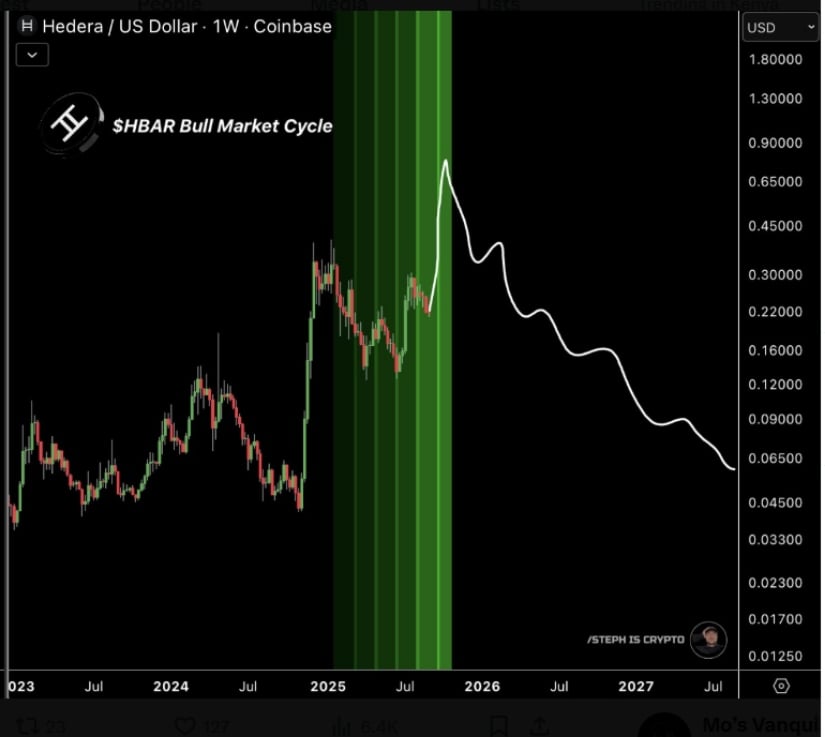 Another analyst, STEPH IS CRYPTO, provided a broader market outlook, suggesting that Hedera may be entering the final stage of its current bull market. A weekly chart shared on X shows a green-shaded window extending into mid-2025, which is described as a period of strong upward movement.