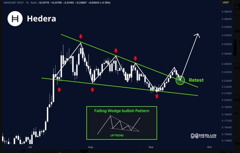 Hedera’s native token has confirmed a breakout from a falling wedge pattern, a bullish technical formation often seen before upward price moves. Analyst Merlijn The Trader reported on X that the token broke above the descending resistance line, marking the completion of the pattern and a potential shift from a downtrend to an uptrend. The price has also retested the breakout level, strengthening the technical case for continued gains.