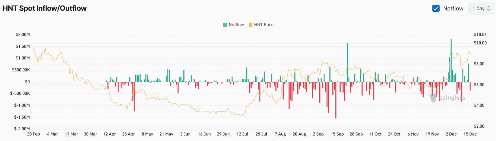 Meanwhile, long-term holders also seem to be showing interest in the altcoin. Data from HNT’s spot inflow/outflow reveals that exchanges have witnessed a modest outflow of $365k worth of HNT.