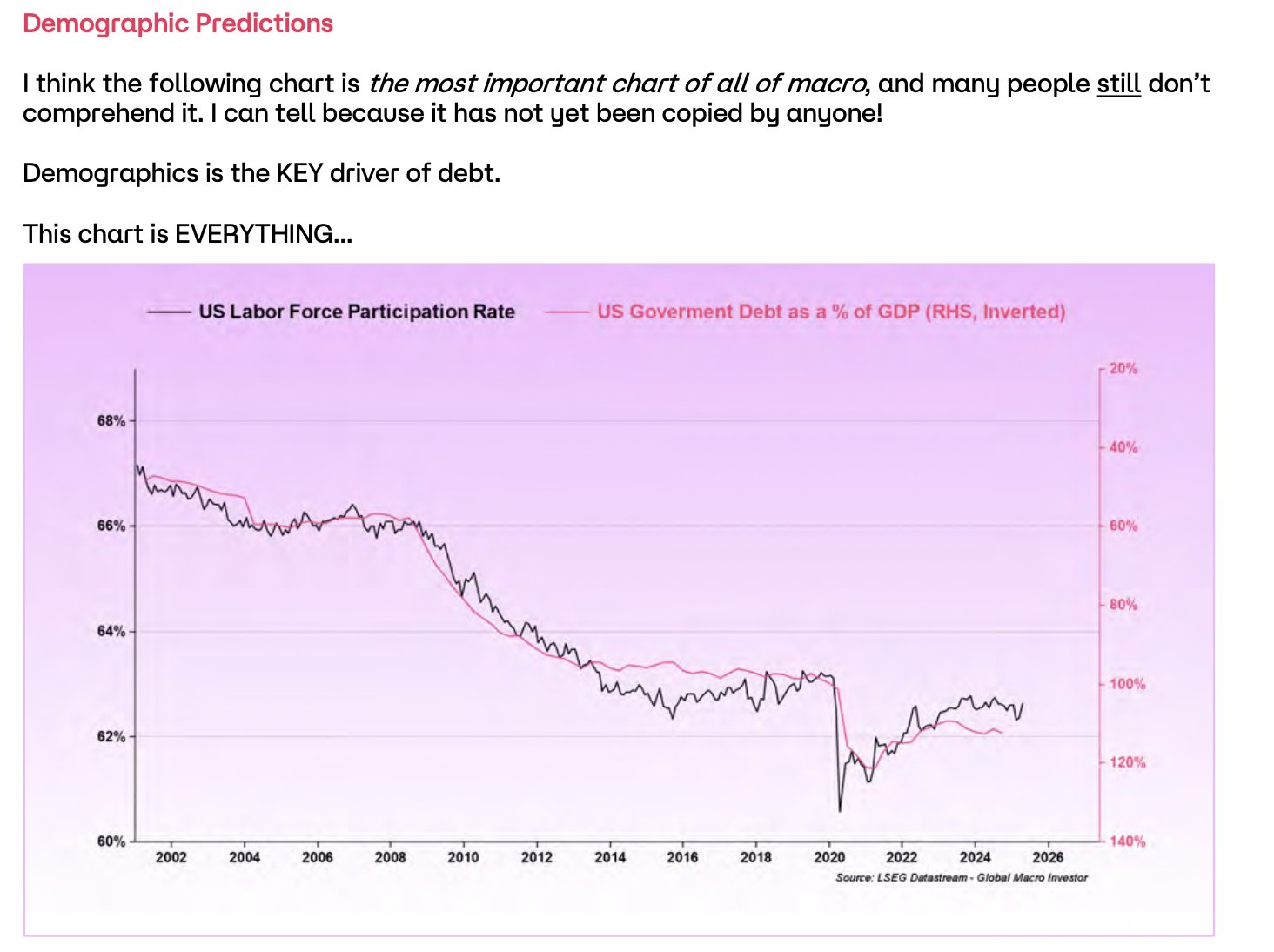 The Real Vision chief executive and co-founder tells his 1.2 million followers on X that aging demographics force governments to borrow more money to support gross domestic product (GDP) growth and pay interest on the debt.