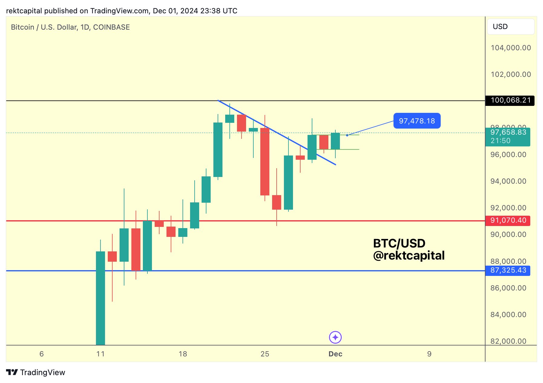 A daily close above the bull flag resistance of ~$97,450 could kickstart additional trend continuation to get closer to challenging $100,000 once again.”