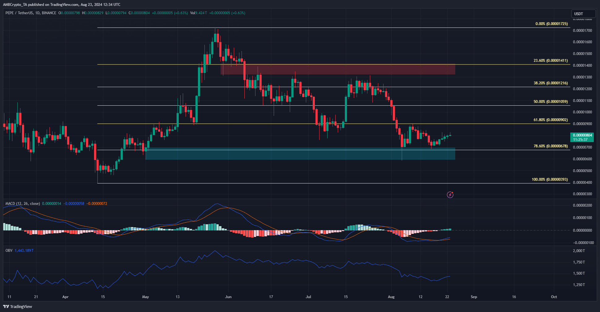 On 5 August, when Bitcoin [BTC] fell to $49k, Pepe [PEPE] revisited its 78.6% Fibonacci retracement level at $0.0000068. The memecoin has not been able to replicate the price action of other major altcoins.
