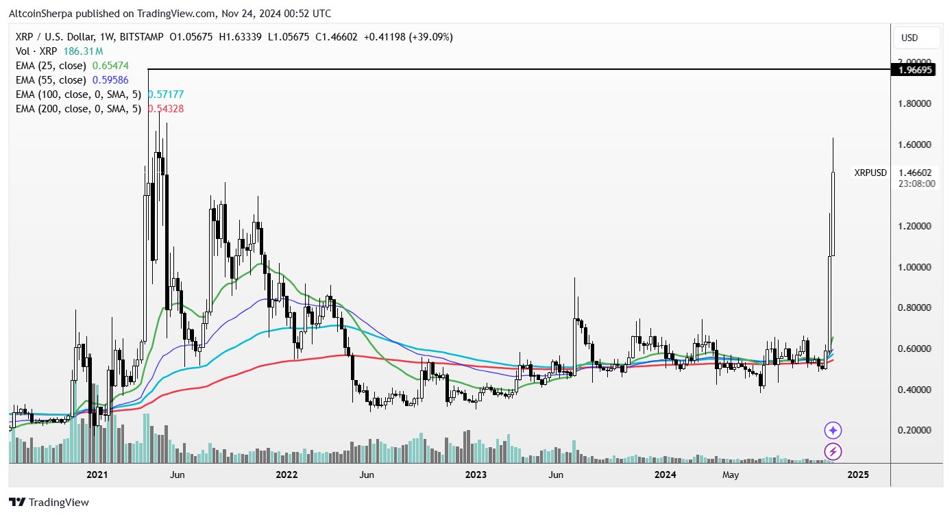 Altcoin Sherpa is also looking at XRP, the native token for the XRP Ledger (XRPL), which is up about 180% just this month. The trader says XRP is one to watch in the potential upcoming altcoin season.