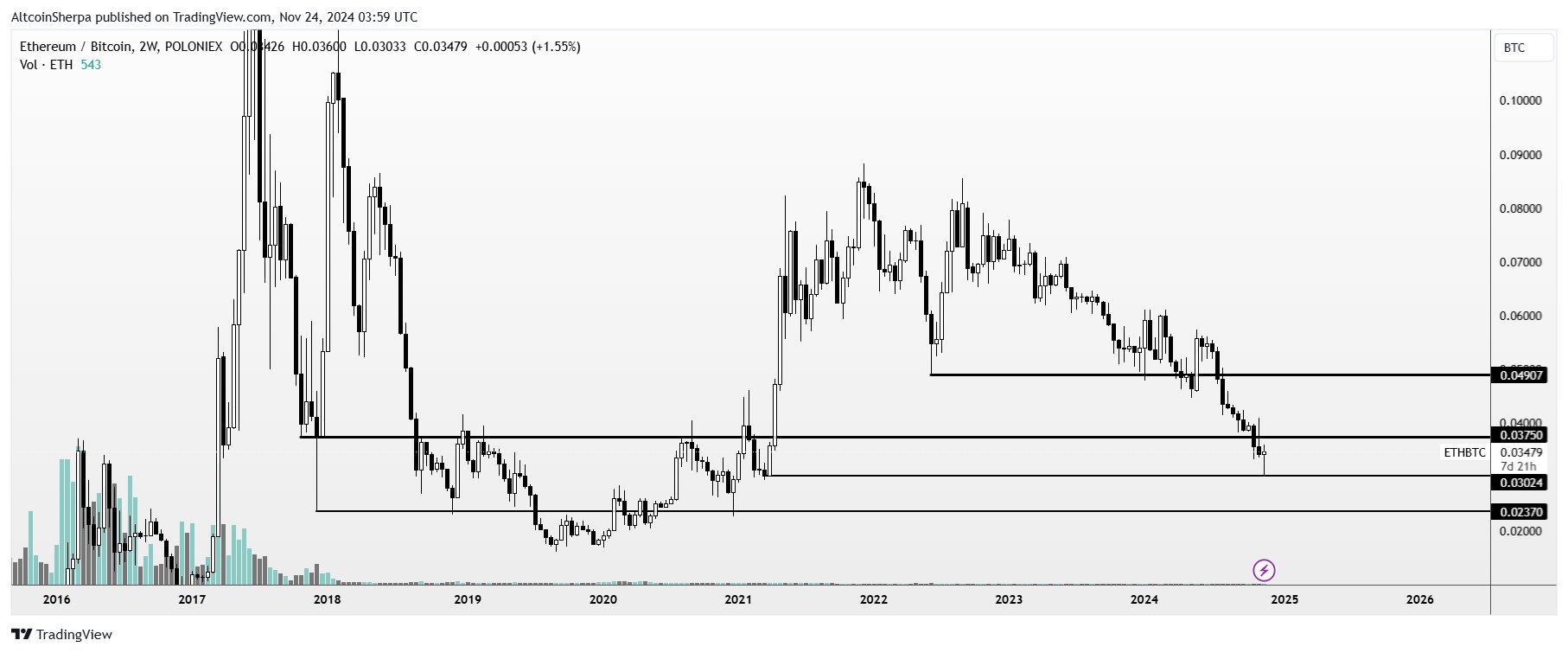 Popular crypto analyst Altcoin Sherpa says that Ethereum (ETH) is likely approaching a cycle bottom in its Bitcoin pair (ETH/BTC).