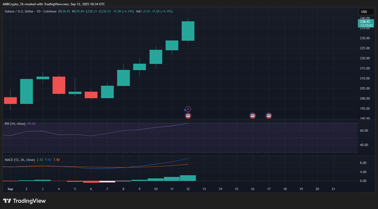 On the price front, SOL rallied to $238, up by 4.2% on the day, with its RSI just below the overbought zone.