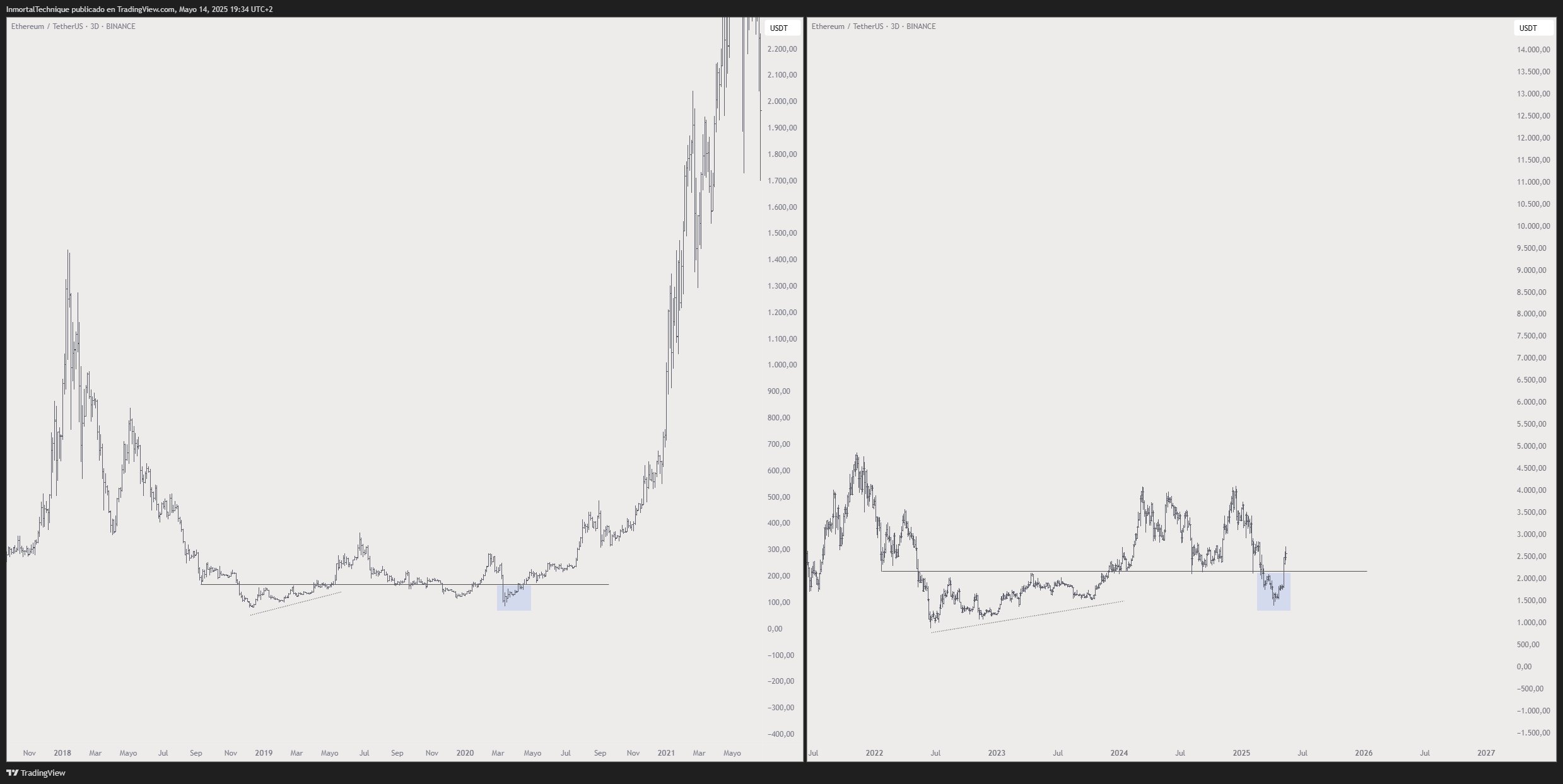 Pseudonymous analyst Inmortal tells his 232,300 followers on the social media platform X that Ethereum’s market structure on the three-day chart looks very similar to its early 2020 price action.