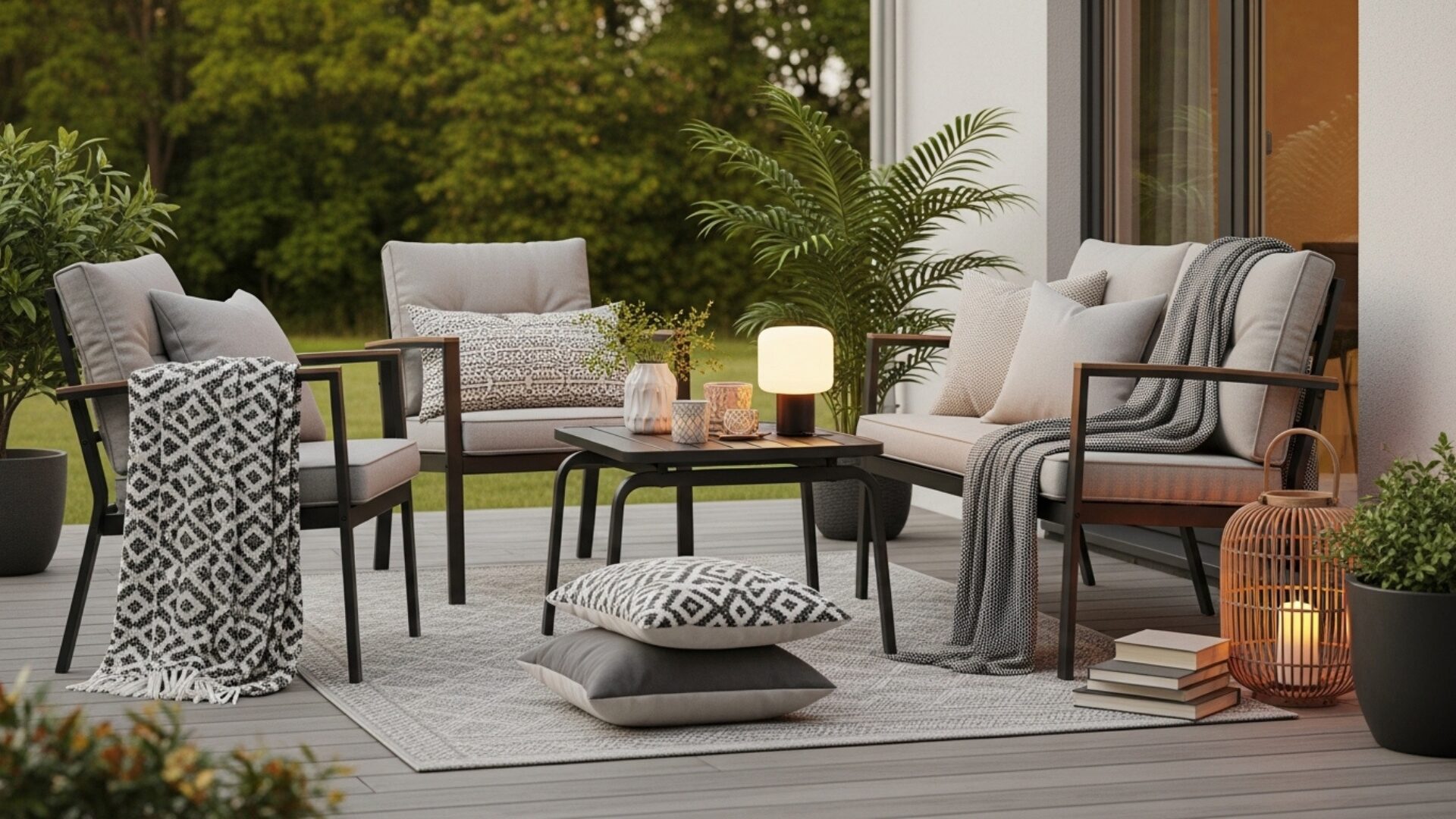 Start with the basics: comfy chairs, a table lamp for some ambient lighting, and, of course, an area rug to define the space. Add some fun accessories like pillows or a throw blanket to make it cozy and inviting. Outdoor essentials are all about creating zones—your own little haven for family time or entertaining guests.