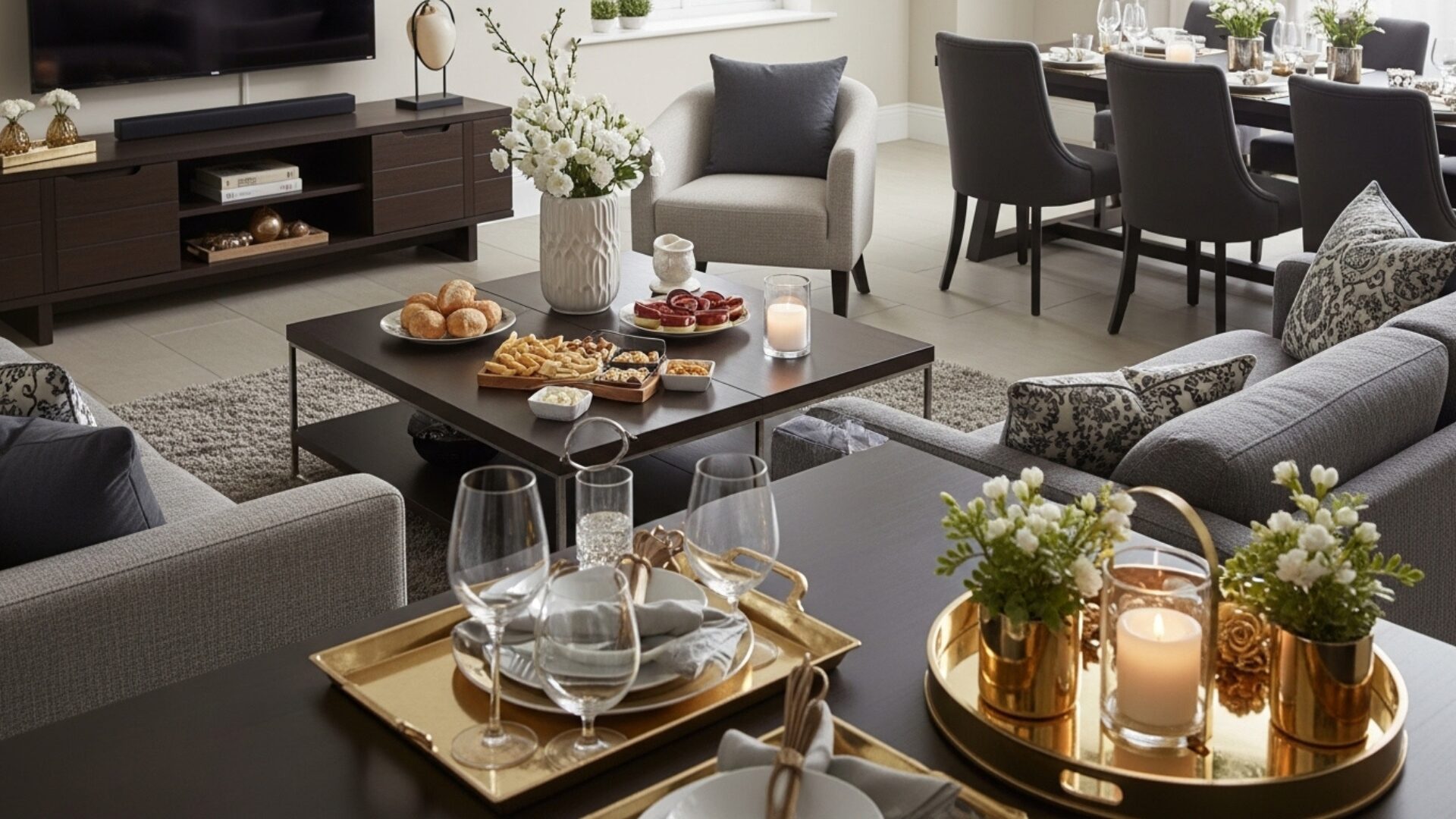 My favorite way to set up for entertaining guests is to arrange comfortable seating around a central coffee table, making it easy for everyone to relax and enjoy snacks and drinks together.