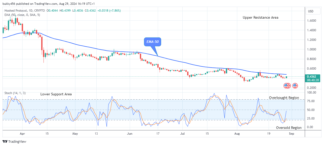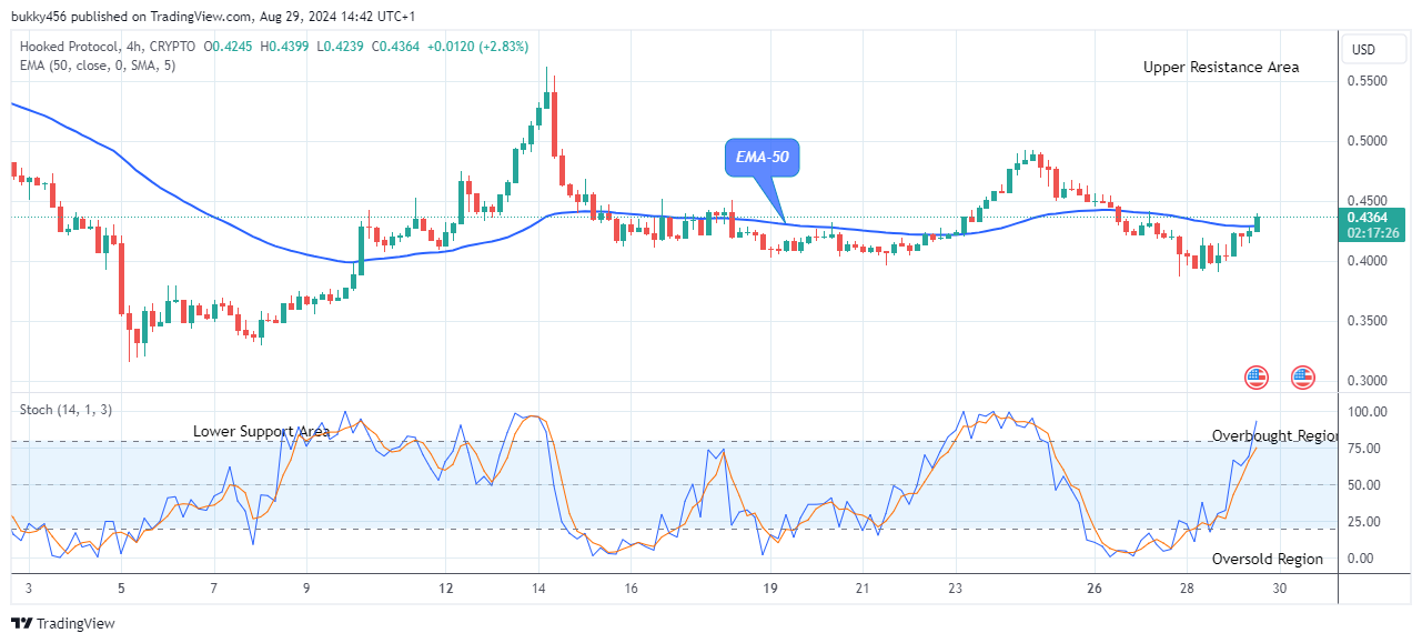 Today, the price of Hooked Protocol targets the $0.56 supply level as the bulls pushed the crypto price to a $0.43 level above the EMA-50, an indication of an upward momentum in the context of the strength of the market.