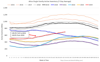 The second graph shows the seasonal pattern for active single-family inventory since 2015.The red line is for 2024. The black line is for 2019.