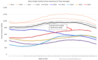 Altos reports that active single-family inventory was down 2.3% week-over-week. Inventory is now 6.7% below the peak for the year (7 weeks ago).