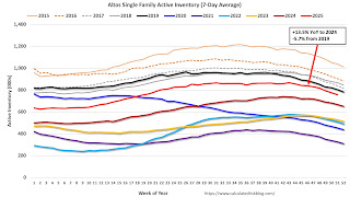 Altos reports that active single-family inventory was down 2.3% week-over-week. Inventory usually declines sharply during the holiday season.