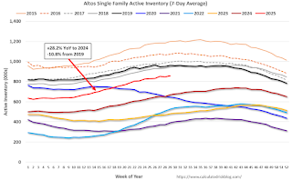 Inventory is now up 37.2% from the seasonal bottom in January. Usually, inventory is up about 21% from the seasonal low by this week in the year. So, 2025 is seeing a larger than normal increase in inventory.
