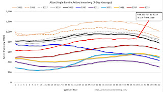 Altos reports that active single-family inventory was down 1.3% week-over-week. Inventory usually starts to decline in the fall and then declines sharply during the holiday season.
