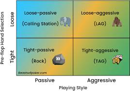 So you have all that data and it allows you to put players in a box. Below is the classic looseness/aggression quadrant. You have to understand that almost all players become an archetype based on their tendencies–especially so at lower levels where amateurs lack the self-awareness and skill to change up their patterns. Once you have boxed a player down, you follow simple heuristics on how to adjust to their play.
