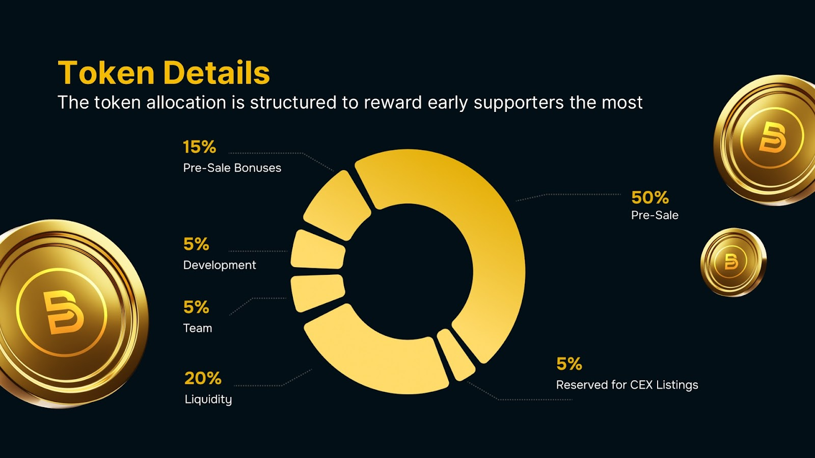 Tokenomics are designed to favour early participants: out of a total 3.5 billion tokens, 65% are allocated to the presale and bonuses, while only 5% is reserved for the team.