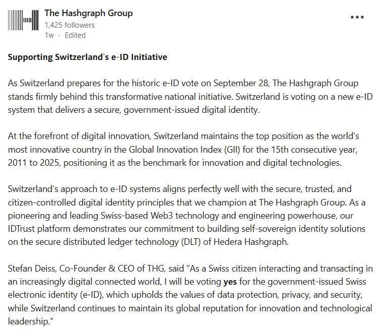 Stefan Deiss, Co-Founder & CEO of The Hashgraph Group, gave their support of Switzerland’s e-ID system on LinkedIn, saying:
