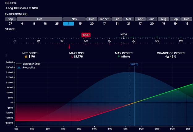 The risk graph of the NVDA option looks like the following for an investor who has purchased 100 shares of NVDA and one contract of a $100-strike put option expiring on November 1st: