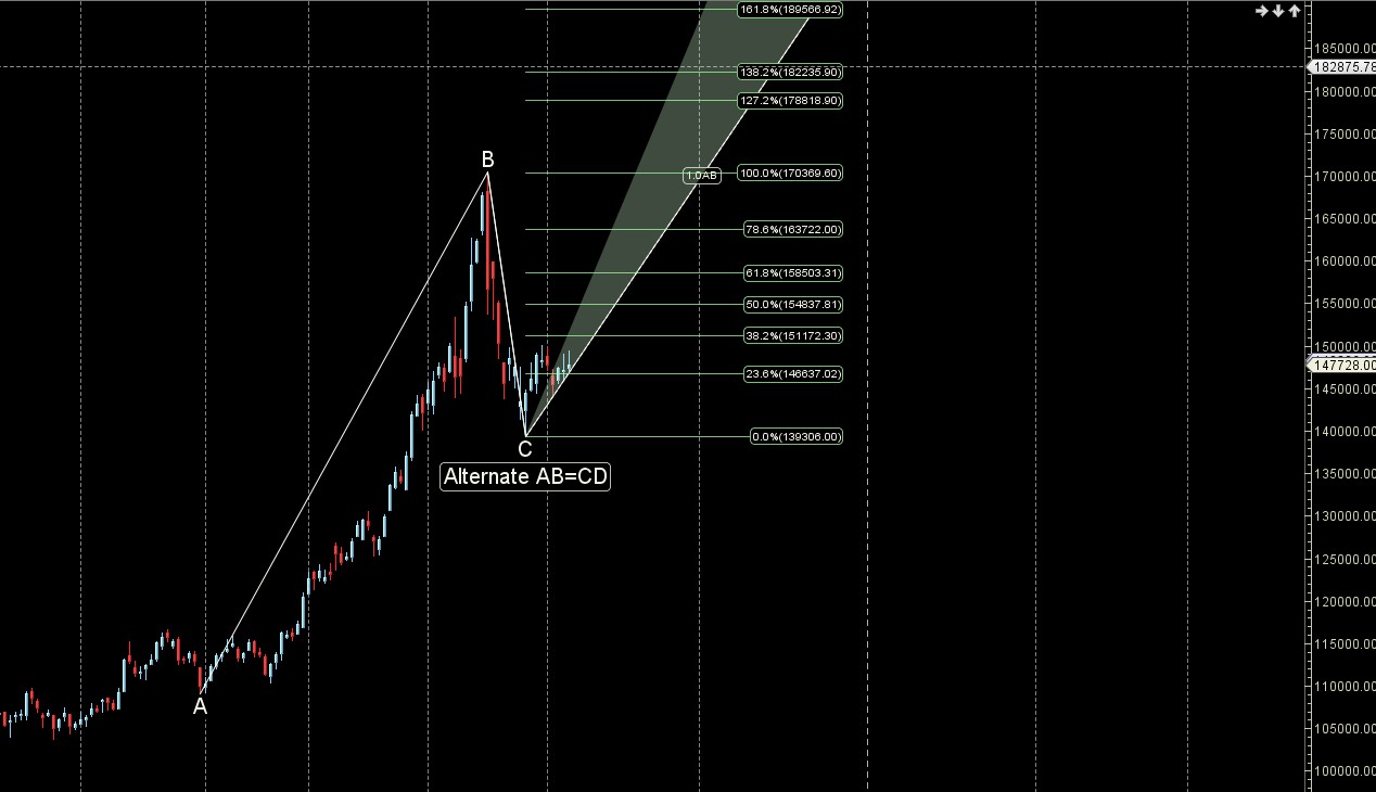 Silver has broken its 4×3 gann angle resistance zone break of 145 K can see a sharper pullback towards 140 K