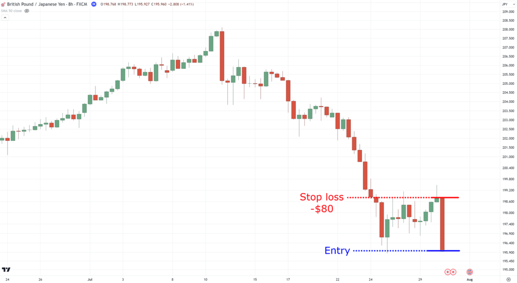 Let’s say you have a $3,000 account and you’re risking 1% which is $30 and your stop loss is around 50 pips.