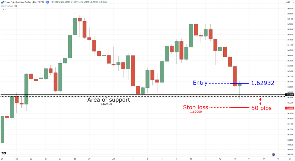 Finally, for this example, you decided to place your stop loss 50 pips below the area of support: