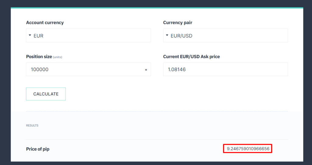 Looking at the calculator, our pip value is $9.25 per one standard lot (yes, in this case always put 100k)