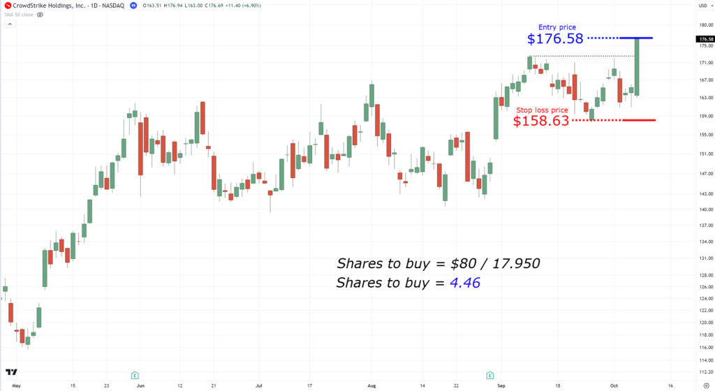 This means that if my stop loss is hit, I want to make sure that I don’t lose more than $80 on my overall portfolio.