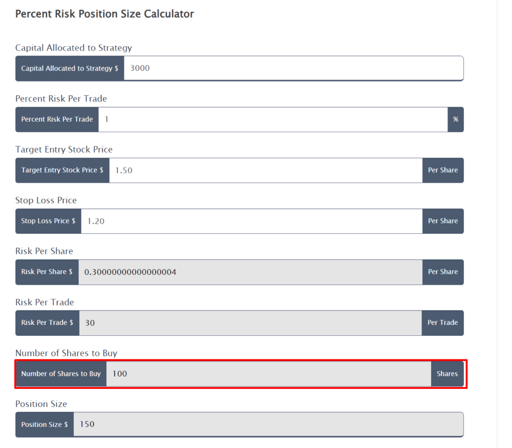 But this time, I entered that I’d be risking 1% per trade, that the stock’s entry price is $1.50, and I wanted the stop loss at $1.40.