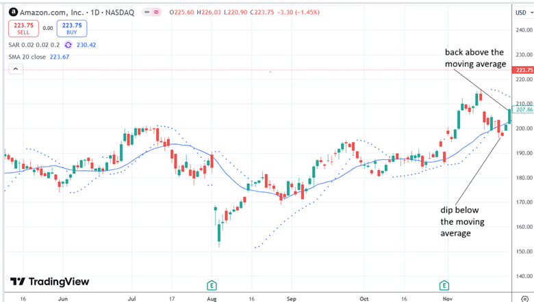 Since Amazon’s longer-term trend is bullish, we are looking for the PSAR to indicate a shorter-term bearish trend that is shifting back to the longer-term bullish trend.