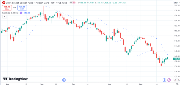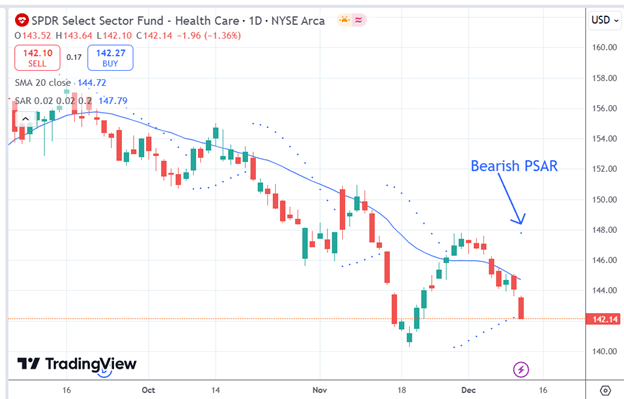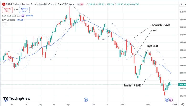 This can be seen in the example here where a trader might short XLV upon seeing the bearish PSAR signal:
