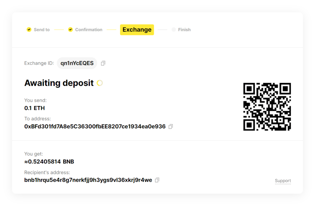 In the second step, you need to provide the BNB crypto recipient address. The recipient address must match the crypto you are going to receive. Remember to double-check the information you enter prior to the exchange as the transaction you make cannot be canceled.