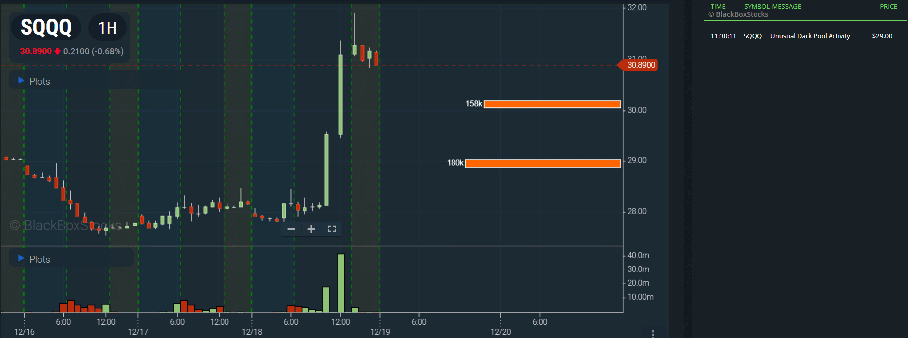 On December 18, two significant dark poolDark pools are private trading venues or exchanges where institutional investors, such as mutual funds, hedge funds, and pension funds, can trade large blocks of securities away fr… trades in SQQQ stood out: