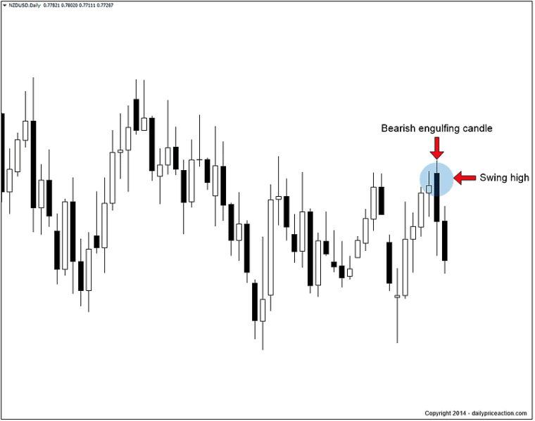 Let’s walk through an example. Below is a bearish engulfing pattern that formed at a swing high on the NZDUSD daily time frame.