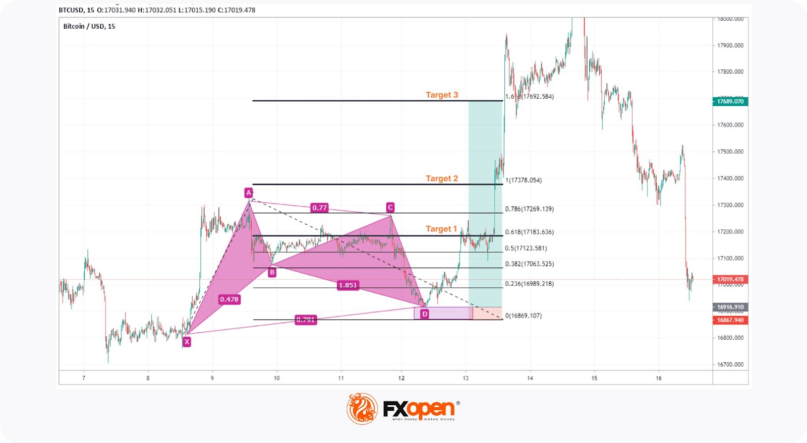 Using the Fibonacci extension first drawn from X to A and then to the D point, we could place the first target at $17,183 at the 0.618 Fib level. That comes at the 1:3 risk/reward ratio, thus making this position viable.