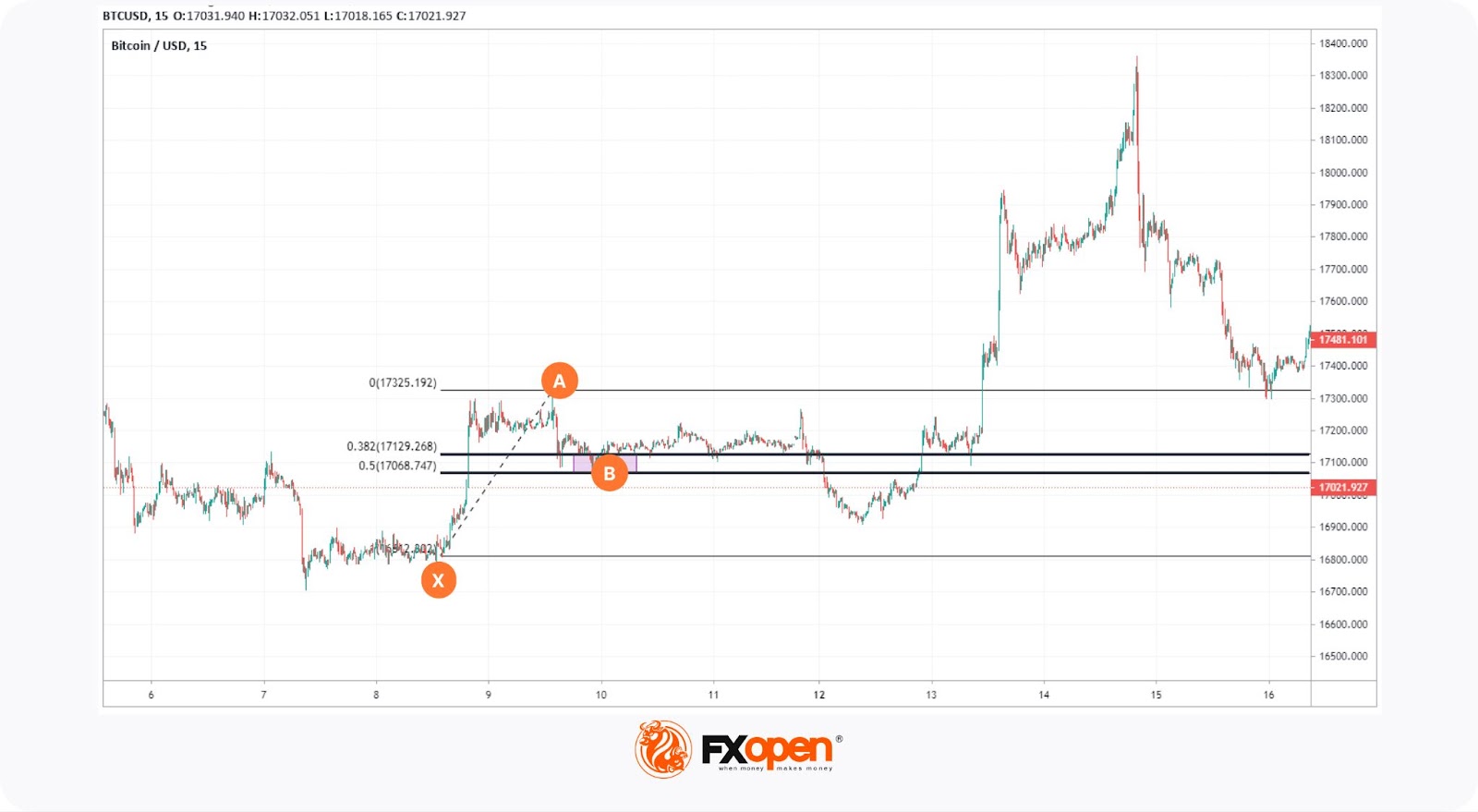 It is important to be mindful of the horizontal support or resistance the zone correlates with, as this confluence points out the highest probability reversal level. In the case of Bitcoin, the price interacted with the 0.786 Fib retracement (D), which was on the horizontal support at $16,923.