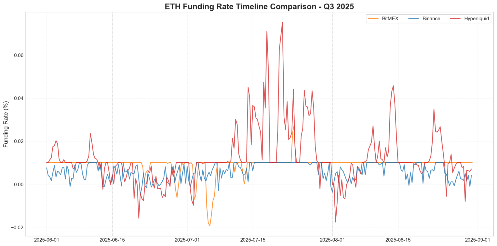 Рисунок 5: Сравнение динамики ставки финансирования ETH за 3-й квартал 2025 года. Hyperliquid (красный) характеризуется высокой волатильностью и частыми, резкими всплесками, в то время как BitMEX (оранжевый) и Binance (синий) поддерживают более стабильную и предсказуемую среду для ставок.