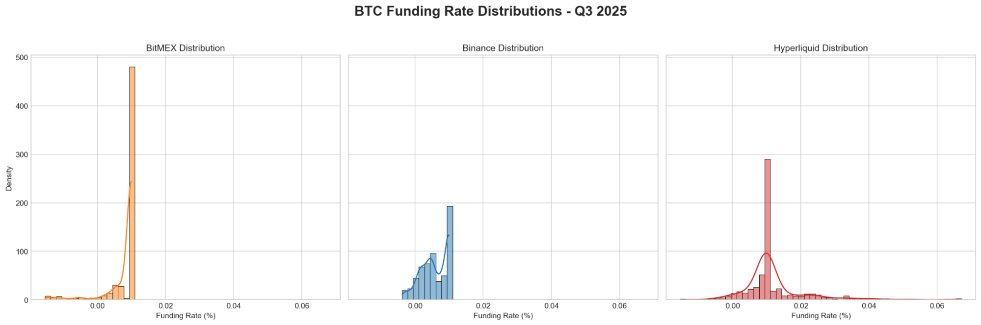 Чтобы проверить, верны ли вышеизложенные тезисы о «поле» и «потолке» ставок финансирования, мы проанализировали данные о ставках финансирования за 3-й квартал 2025 года на биржах BitMEX, Binance и Hyperliquid. Это подтвердило две основные теории, обсуждавшиеся в предыдущем разделе: